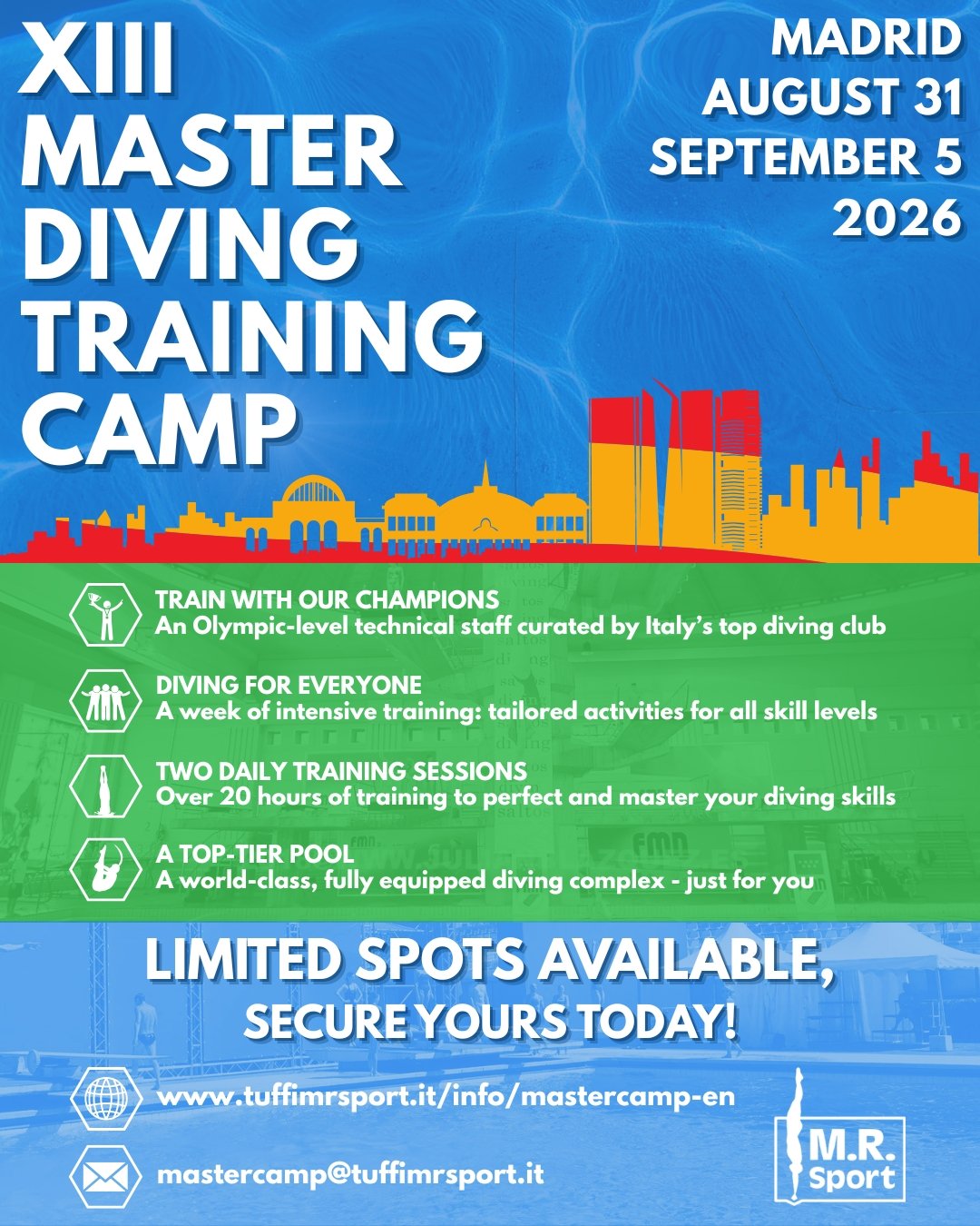 • A week of intensive training at the "Centro de Natación M’86" aquatic complex in Madrid: a World Aquatics-compliant diving pool which hosted the 1986 World Aquatics Championships, the 2004 European Aquatics Championships and a yearly World Aquatics diving Recognised Event, which will be reserved for the event.